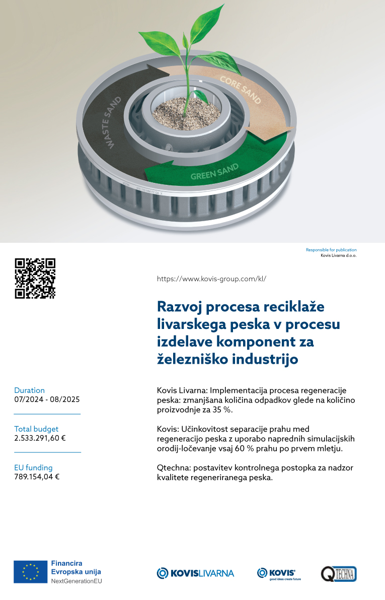 Kovis Livarna: Implementacija procesa regeneracije peska: zmanjšana količina odpadkov glede na količino proizvodnje za 35 %.
