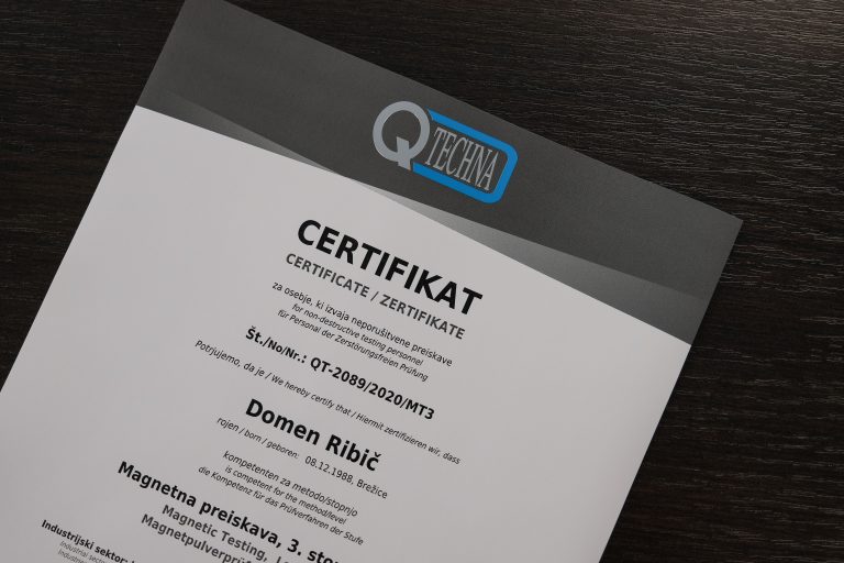 U skladu sa zahtjevima SIST EN ISO / IEC 17024, provodimo certificiranje osoblja za ispitivanje bez razaranja u skladu sa standardom SIST EN ISO 9712. Certificiranja provode se za sve metode navedene u rubrici NDT metode i grupe proizvoda, tj. odljevci, otkovci, zavari, cijevi i lijevani proizvodi.